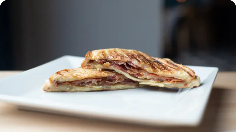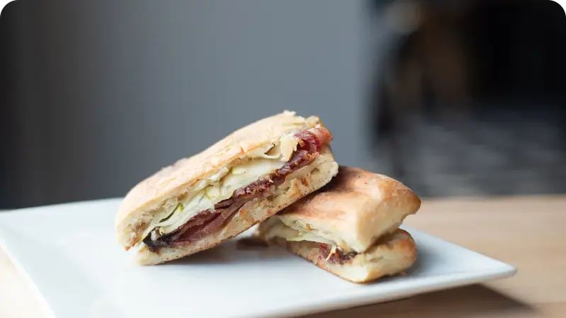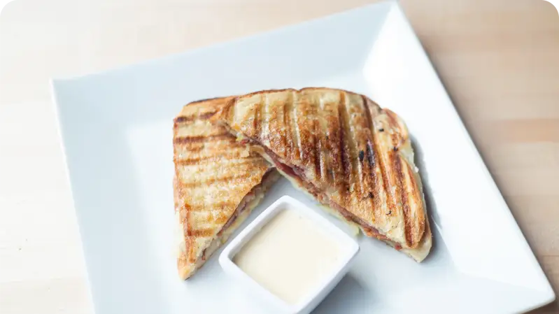 Ciabatta bread, Swiss cheese, garlic aioli, caramelized onions